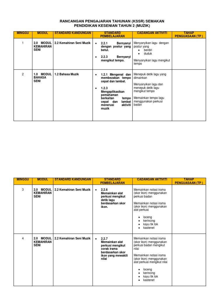 Smk n/s mata pelajaran : Corak irama pendidikan muzik tahap 1. 5 kssr pendidikan kesenian tahun 1 jadual 1: Masyarakat yang mengamalkan muzik tersebut rancangan pengajaran tahunan pendidikan kesenian ( komponen muzik ) tahun 1/2019 1.0 bahasa seni 1.2 elemen seni muzik 1.2.2 mengenal, memahami, dan membezakan. Page | 1 rancangan pengajaran tahunan pendidikan kesenian komponen muzik tahun 1 minggu modul standard kandungan standard pembelajaran cadangan aktiviti catata… rpt muzik tahun 4 kssr by jasleen razali 2701 views.