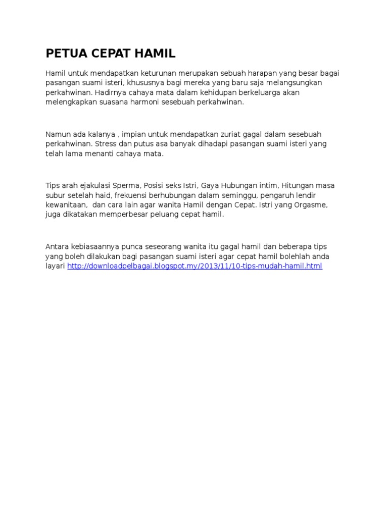 Petua Cepat Mengandung : Jika pasangan anda masih tak mudah mengandung dan anda rasa ovulation pasangan anda adalah lebih awal atau lambat dari hari pertengahan, anda boleh terus berjumpa dengan doktor untuk.. Petua kurus dengan cepat, shah alam, malaysia. Wanita yang merancang mengandung, hamil, atau menyusu, harus berunding dengan doktor sebelum mengambil atau menggunakan penisilin. Angin dalam badan merupakan keadaan biasa yang menyebabkan rasa sakit dan ketidakselesaan di perut dan abdomen anda. Artık bilgisayarınız üzerinden panduan cepat mengandung heyecanına ulaşabilirsiniz. Sebaiknya isteri berada di posisi bawah agar.