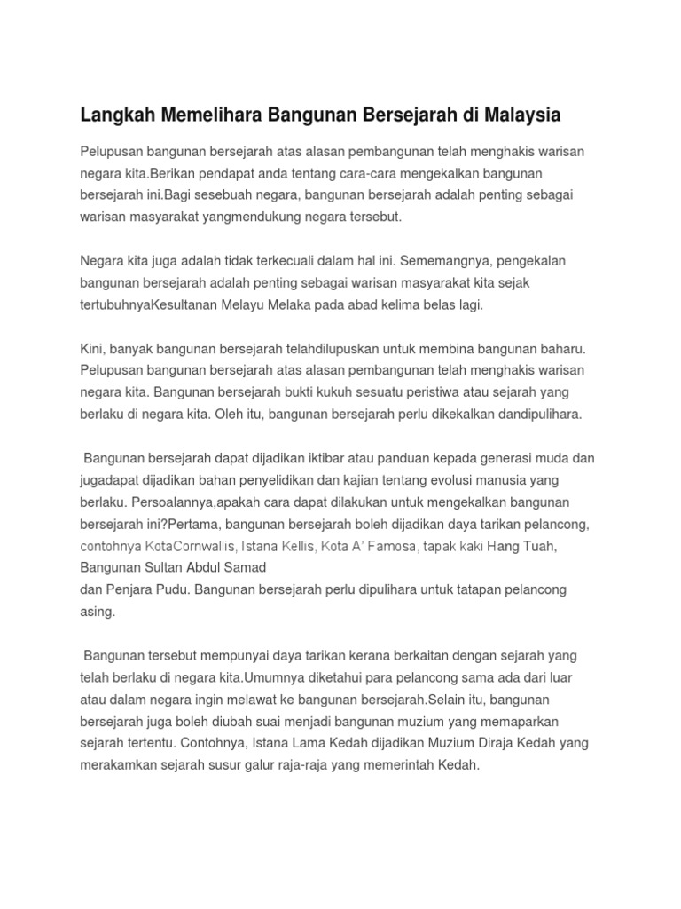 Langkah Memelihara Bangunan Sejarah Di Malaysia Mysemakan from i1.wp.com Sektor pelancongan di negara ini yang berkembang dengan pesat ada kaitannya dengan pelbagai daya tarikan yang unik. Cara memelihara ikan lele infoikan.com pernah ternak lele di kolam tembok? Kerajaan perlu menyediakan dana yang besar. Bangunan bersejarah merupakan sebuah bangunan yang dibina pada zaman dahulu yang menceritakan evolusi manusia dan memberi nilai sejarah yang. Bangunan bersejarah dapat dijadikan iktibar atau panduan kepada generasi muda dan juga dapat dijadikan bahan penyelidikan dan kajian tentang. You have just read the article entitled langkah untuk memelihara dan memulihara bangunan bersejarah tingkatan 1. Malaysia kaya dengan bangunan dan monumen bersejarah. Presiden sukarno membangun ini dengan tujuan mengenang.